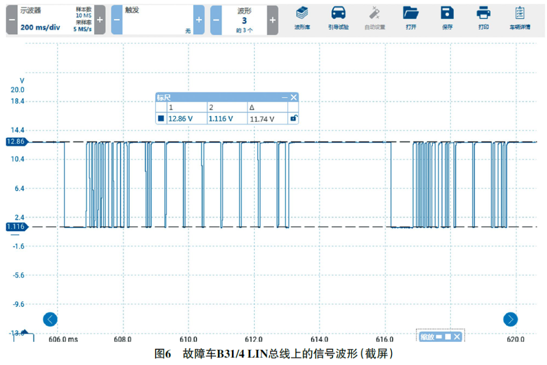 故障排除:更换B31/4后试车,多媒体显示屏上的空气质量选项显示正常,故障排除。虽然使用故障检测仪无法读取B31/4数据,但使用示波器的译码功能仍可以从数据层面对B31/4的信号进行分析,从而能够精准地判断故障点。