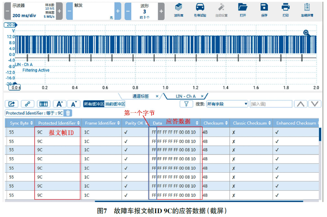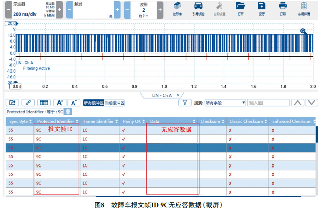 尝试用故障检测仪读取B31/4数据,未发现相关数据项。用万用表测量B31/4的供电和搭铁,均正常。用虹科Pico汽车示波器测量B31/4 LIN总线上的信号波形(图6),发现LIN总线上有信号发送,高电位约为12.9 V,低电位约为1.1 V,无明显异常;对信号进行译码,发现共有15个数据帧ID;脱开B31/4导线连接器后再测量LIN总线上的信号波形并进行译码,通过对比发现,未脱开B31/4导线连接器时,报文帧ID 9C有应答数据(图7),而脱开B31/4导线连接器后报文帧ID9C变为无应答数据(图8),由此推断报文帧ID 9C对应B31/4。